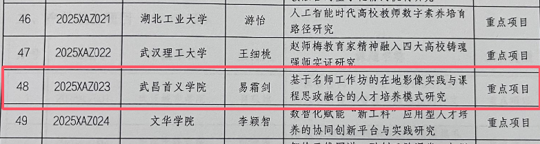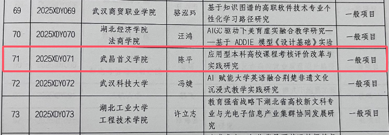湖北省高等教育学会发布《关于2025年度湖北省高等教育学会教育科研项目立项的通知》,新闻与文法学院易霜剑老师的《基于名师工作坊的在地影像实践与课程思政融合的人才培养模式研究》获批学会学术成果项目重点课题,经济管理学院陈平老师的《应用型本科高校课程考核评价改革与实践研究》获批学会共同体建设项目一般课题。