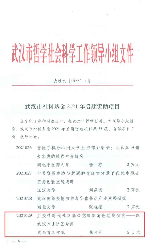 近日我校收到《武汉市社科基金2021年后期资助项目》文件,经济管理学院焦雨生老师的项目《后疫情时代社区基层党组织角色功能研究——以武汉市J社区为例》获批,获资助2万元。