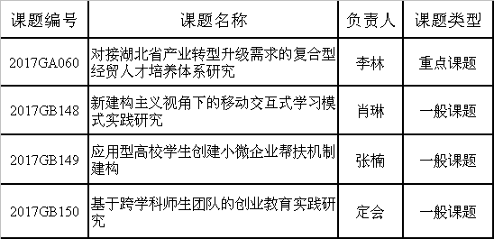 近日,省教育厅公布了《省教育厅关于下达省教育科学规划2017年度课题的通知》(鄂教科研【2017】6号),我校李林老师获批重点课题,肖琳、张楠、定会老师获批一般课题,具体如下: