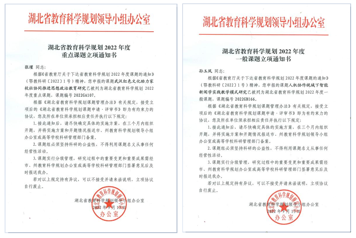 近日,我校收到湖北省教育厅《关于下达省教育科学规划2022年度课题的通知》,我校获批重点项目和一般项目各一项,重点项目为马克思主义学院张瑾老师的《武汉红色文化助力家校社协同推进思想政治教育研究》(立项号2022GA107),一般项目为新闻与文法学院孙玉凤老师的《人机协作视域下智能新闻学实践教学模式研究》(立项号2022GB166)。